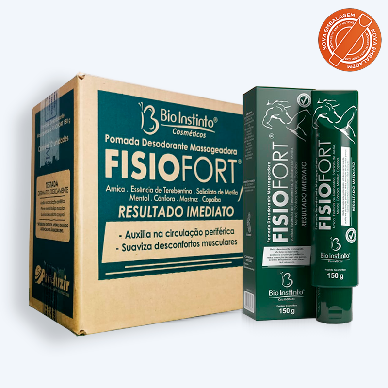 Nova embalagem e efeito desodorante duradouro. A Pomada Massageadora Fisiofort Bio Instinto possui fórmula nova, 0% Parabenos e 0% Petrolatum. É um produto cosmético elaborado com extratos vegetais típicos da flora brasileira. Sua função é promover relaxamento corporal e auxiliar no alívio da sensação de cansaço corporal após exercícios físicos, má postura ou esforço exagerado.